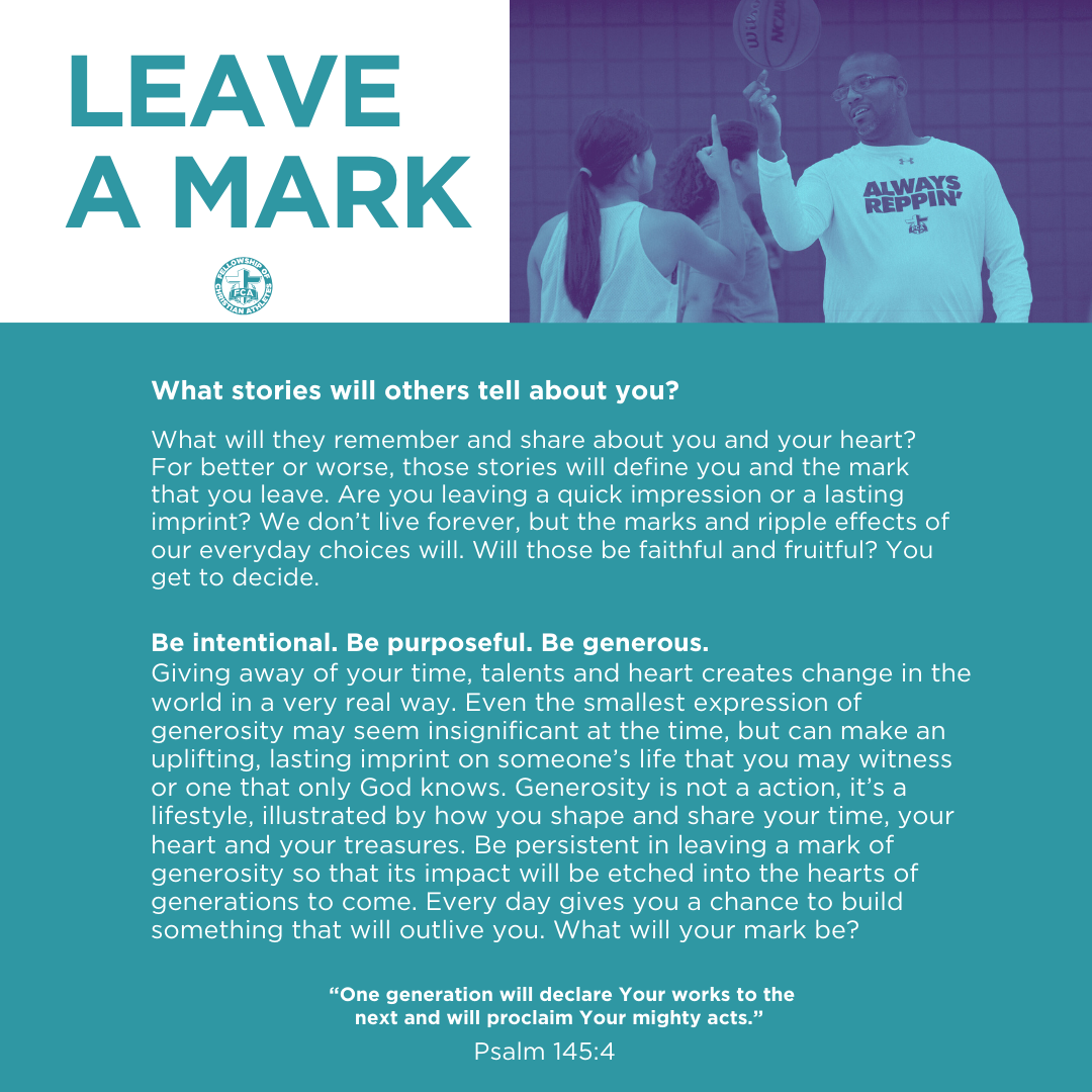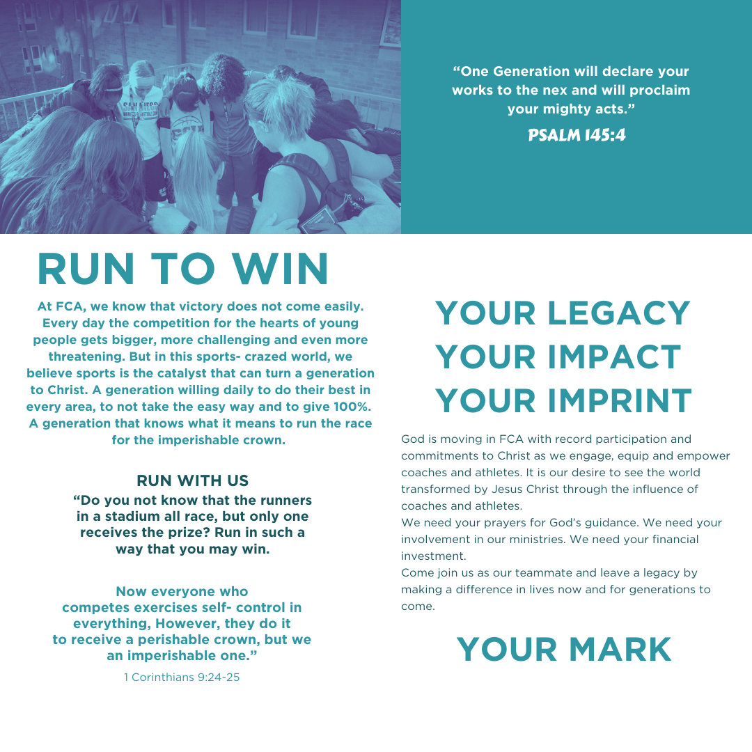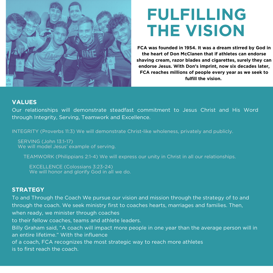 Since 1954, FCA has been challenging coaches and athletes on the professional, college, high school, Junior high and youth levels to use the platform of sport to reach every coach and every athlete with the transforming power of Jesus Christ. FCA focuses on serving our young athletes around the globe by engaging, equipping and empowering every coach and every athlete to unite, inspire and change the world through the gospel. FCA has had a presence in the Central California area for more than 35 years.